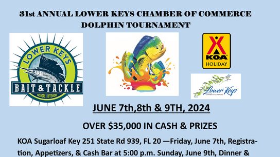 More than $35,000 in cash and prizes awaits anglers targeting dolphin fish in the 30th annual Lower Keys Chamber of Commerce Dolphin Tournament. The contest is scheduled Friday through Sunday, June 2-4, with events headquartered at Kiki’s Sandbar, 183 Barry Ave. on Little Torch Key.